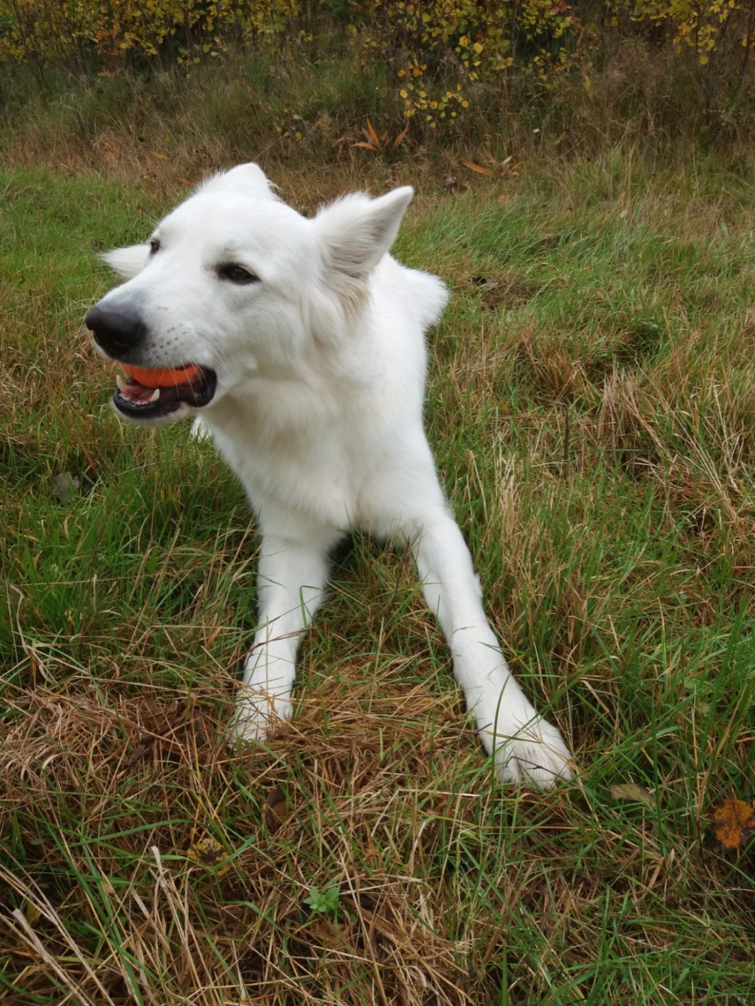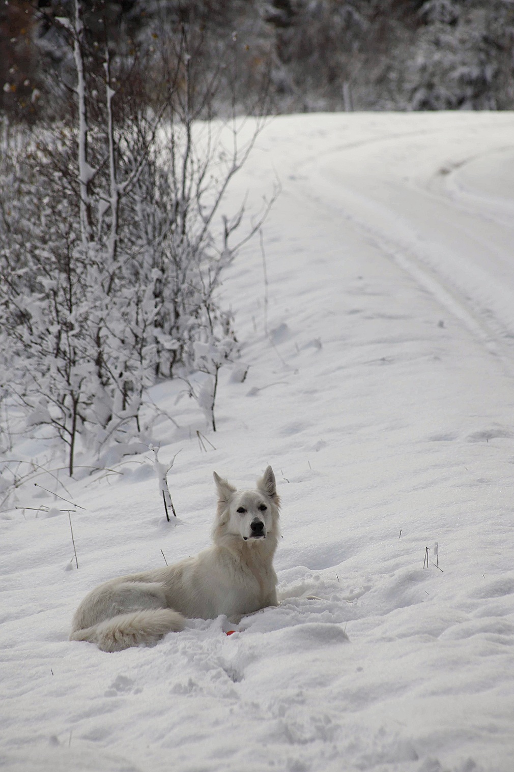 Mitt upp i allt började jag nynna på en sång som jag inte lyssnat på sedan jag var liten och knappt förstod texten. ”Did you know that when it snows my eyes become large and the light that you shine can be seen”. Vidar är ett under av tålmodighet i de lägena. Han lägger sig ner och tuggar på sin boll medan han iakttar mig med något resignerat i blicken. Han vet att jag litegrann glömmer bort att hålla reda på honom när jag antingen pratar eller sjunger högt för mig själv eller tar bilder och nu gjorde jag allt på en gång, fylld av någon slags vinteryra där jag inte kunde kontrollera mig alls.