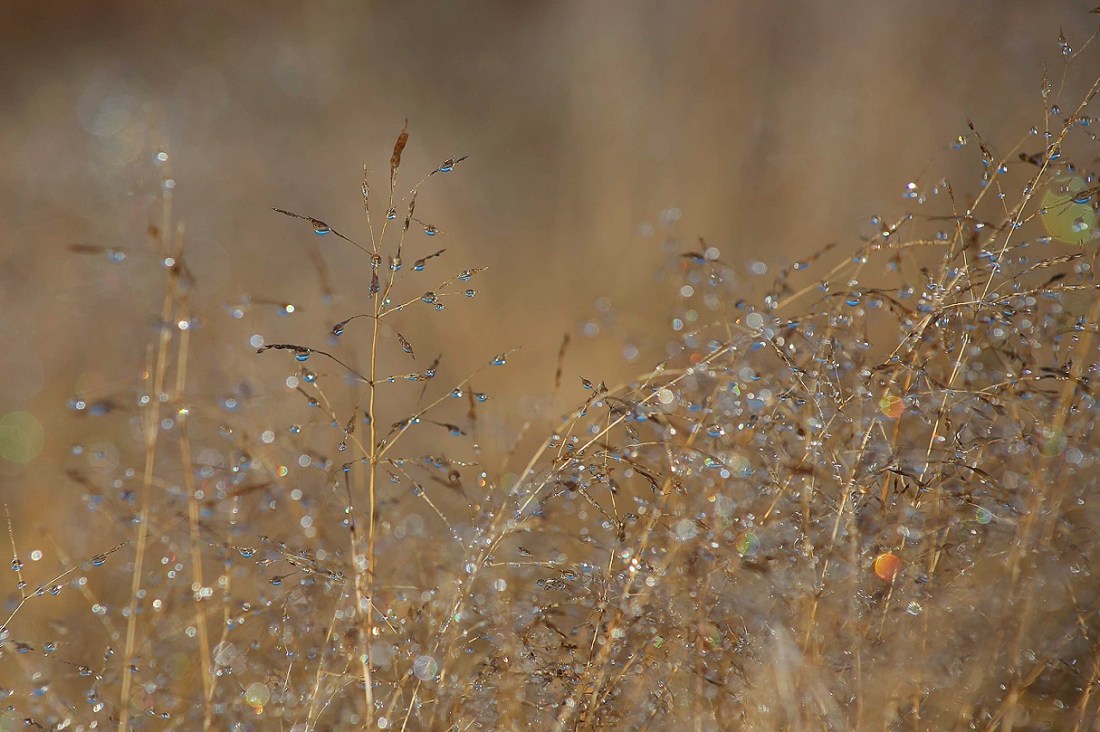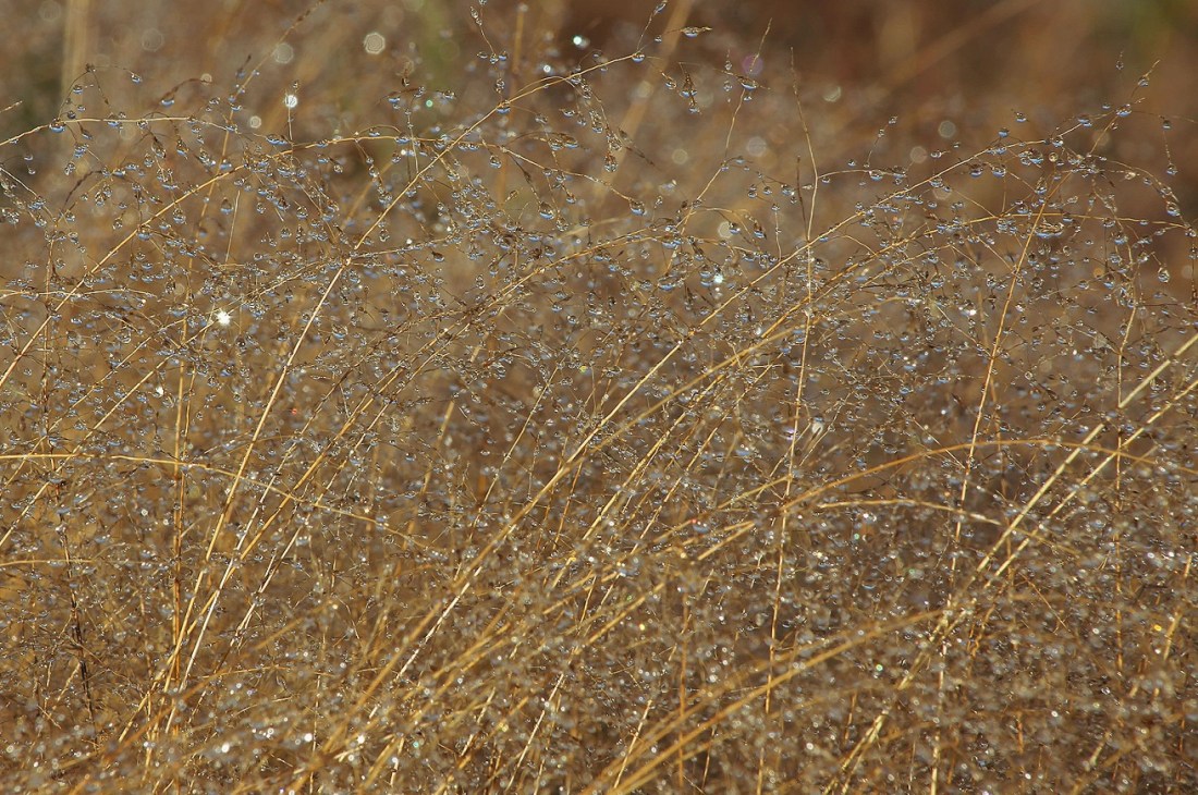 När jag svängt av från vägen och gått genom min lilla portal av tätt växande granar kom vi ut i ett helt annat landskap än där vi gick igår. Under natten hade älvorna dansat över gräset och spritt sina diamanter i överflöd över tyngda vippor och strån.