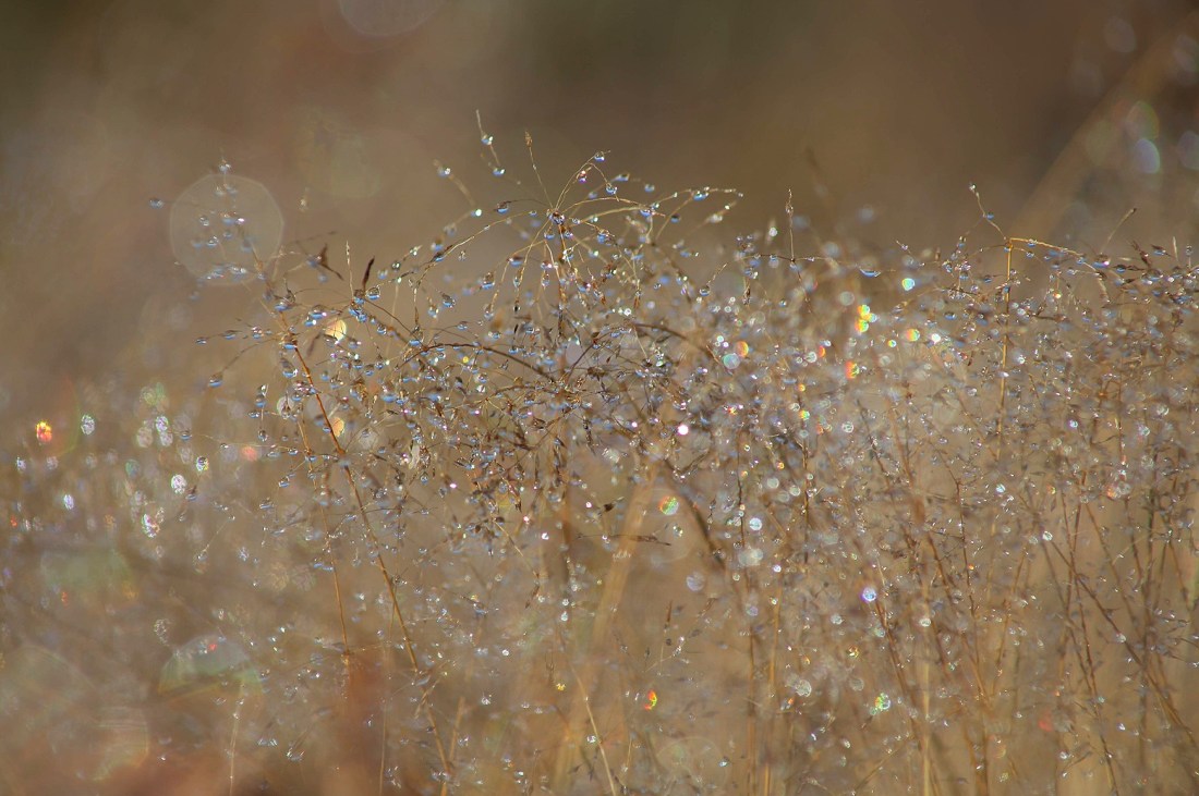 Det är något magiskt med glittret i gräset. Jag kan inte se mig mätt på det och drar mig fnissande till minnes alla de gånger jag suttit och tittat på annat som glittrat, solen som bryter igenom regnet så att det nästan gör ont i ögonen men allra helst när jag var liten och låg framstupa på mage i snön och tittade på regnbågens gnistrande i kristallerna tills jag frös så att jag skakade. Eller när det är en riktigt, riktigt iskall dag då luften är fylld av pyttesmå kristaller som virvlar omkring och sprakar i ett så vackert gnistregn att jag tappar bort vad det var jag borde ha gjort egentligen.