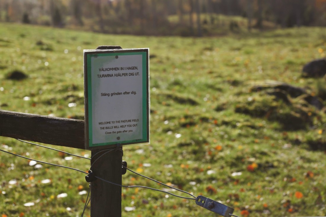 Vid den här tiden på året går jag mest och väntar på att djuren ska få komma in från sina beten och att jag ska kunna ta vägen genom hagarna igen. Så nu gick jag fram och tittade lite extra vid grinden till en av dem. Skylten de satt upp i år är helt och hållet min typ av humor samtidigt som jag ryser lite extra av tanken på att stå öga mot öga med en hög med tjurkalvar helt plötsligt.
