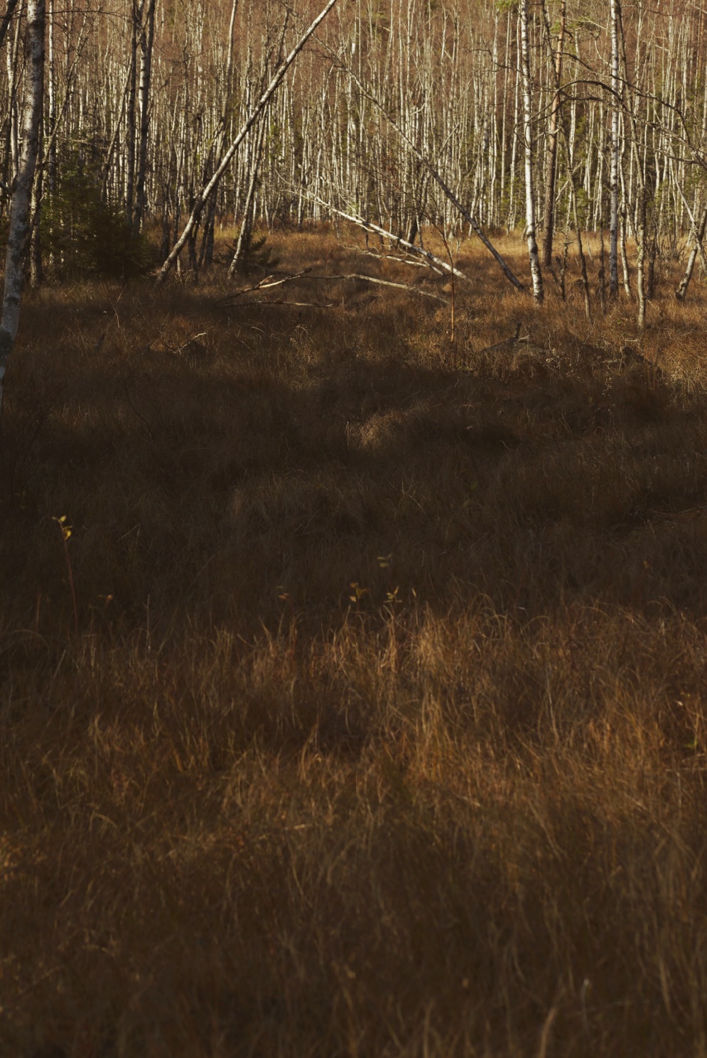 Men den visar sig vara längre än jag räknat med och efter ungefär trehundra meter ger jag upp. Den leder åt helt fel håll och känns mer och mer som en blindväg då den blir sämre och faktiskt möter upp den där sankmarken som jag gissade skulle bre ut sig just där. Jag vill inte gärna gå där på vinst och förlust just idag, men bevarar stället i minnet då det borde vara en perfekt plats att se orrspel till våren. Det var lätt att komma intill utan att behöva vara alltför rädd att trampa ner sig och sikten var relativt fri. I alla fall värt ett försök, enligt mig.