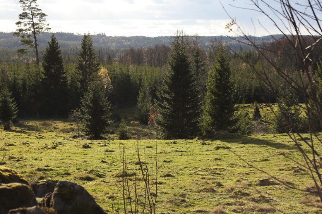 Mitt mål var egentligen att ta mig upp på en av höjderna och njuta av utsikten som jag vet finns där. Självklart ligger det en gård på den vackraste platsen och man ser flera mil därifrån över trädtopparna. Jag hisnar lite varje gång och det där lyckoruset som sprider sig i kroppen är alltid lika härligt. Det är litegrann som att vara i fjällen att se så långt och nu när jag vant mig vid väggarna av gran och tall längs med mina vandringsleder känns det rätt skönt att få kisa ut över oändligheten som kontrast.