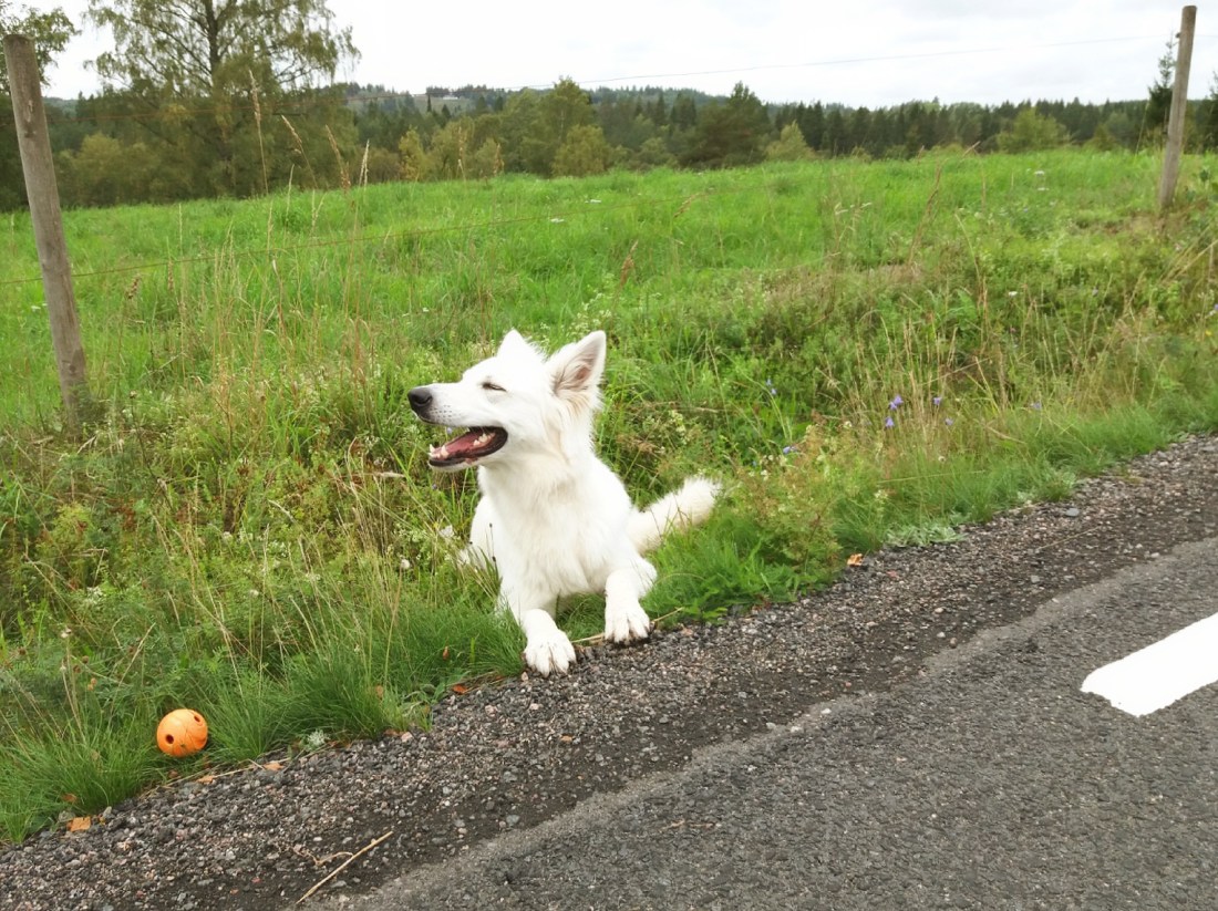 Ingen blev mer förtjust än Vidar och jag fick plötsligt annat att tänka på än mitt fina smycke, funderingar kring ett nytt blogginlägg och de senaste dagarnas händelser. Mitt lilla yrväder skuttade omkring med liv och lust bland riset och eftersom han inte hade en aning om vilken väg vi skulle fick jag dirigera honom ganska ofta. Han är tämligen duktig på att lyssna när jag säger ”vänster” men säger jag ”höger” så svänger han lika glatt åt vänster ännu en gång och pustar jag ett frustrerat ”mäh!” i det läget så börjar han gå i cirklar. Det bådar ju gott för framtiden, haha.