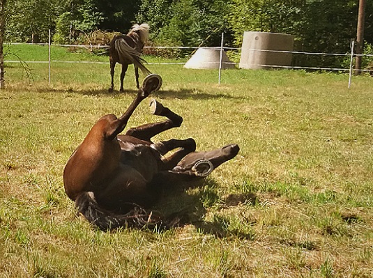 Efteråt fick de som ville gå in i en hage till några av de andra hästarna. Jag gick glatt in och stod plötsligt omringad av fyra hästar på alla sidor, en lite dum plats att vara på ifall de plötsligt får för sig att börja flytta på varandra. Då hinner man inte undan trampande hovar och kastande huvuden, så jag började med att försöka flytta dem som stod närmast mig. I det ögonblicket jag trodde att jag lyckats insåg jag att jag plötsligt fått hjälp. En svart hingst kom bakom mig och föste effektivt undan alla i sin väg och blockerade de andra från att nå fram till mig. Nöjt stod han där och lät sig klappas medan han endast vinklade öronen något bakåt om någon av unghästarna ens vågade titta åt mitt håll. Han försökte till och med följa med mig ut från hagen sedan när det var dags att gå. En märklig, men härlig känsla på samma gång att bli utvald på det viset.