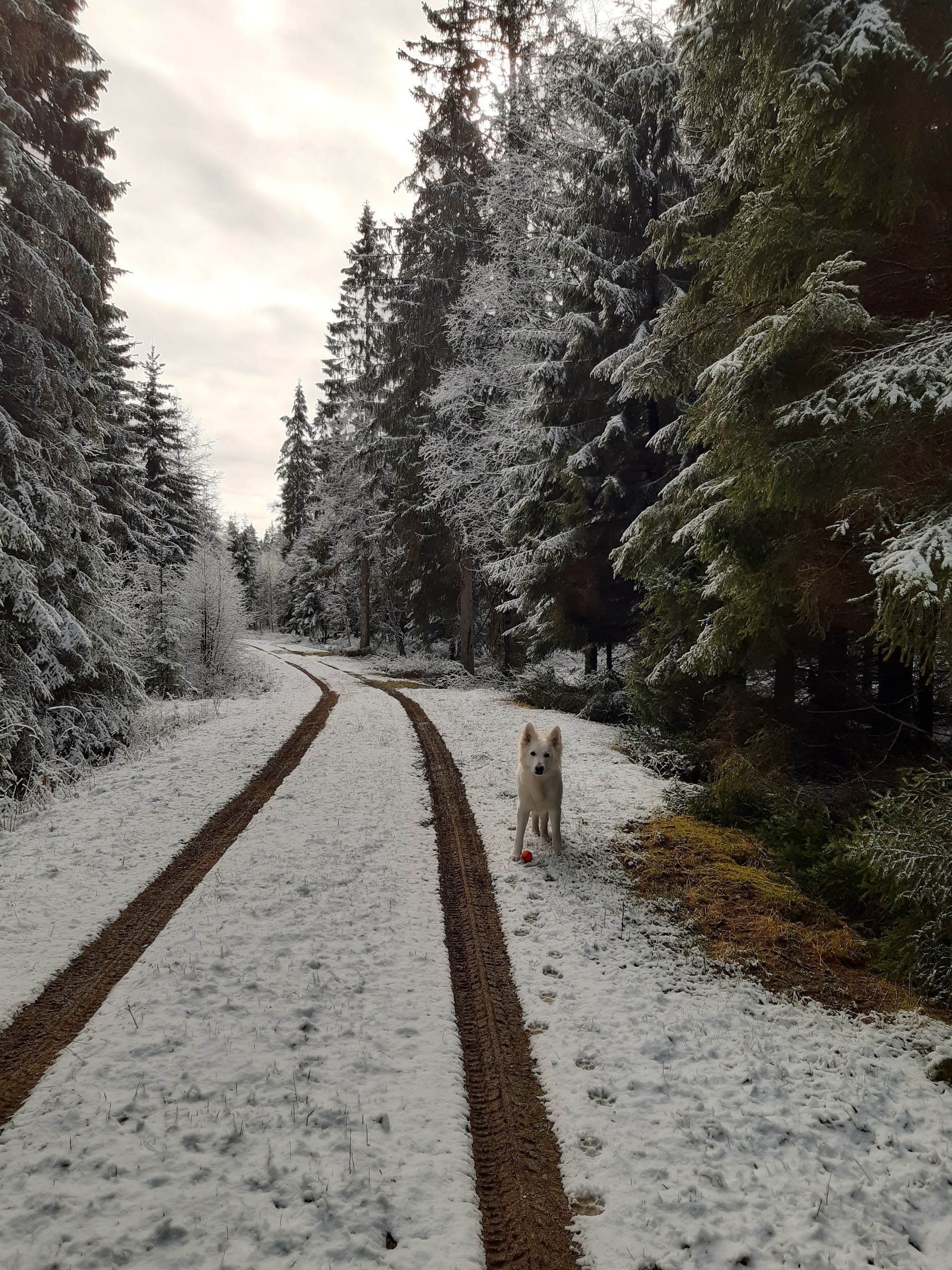 Det slutade alltså inte att snöa. Inte förrän på eftermiddagen och då var det dags för mig att se om hunden ville tugga in sin nya boll. Den andre gamla trotjänaren har hängt med i några år nu och till slut gav den upp. Det lilla hålet som funnits i den väldigt länge blev plötsligt en stor reva och hela bollen blev full med snö.