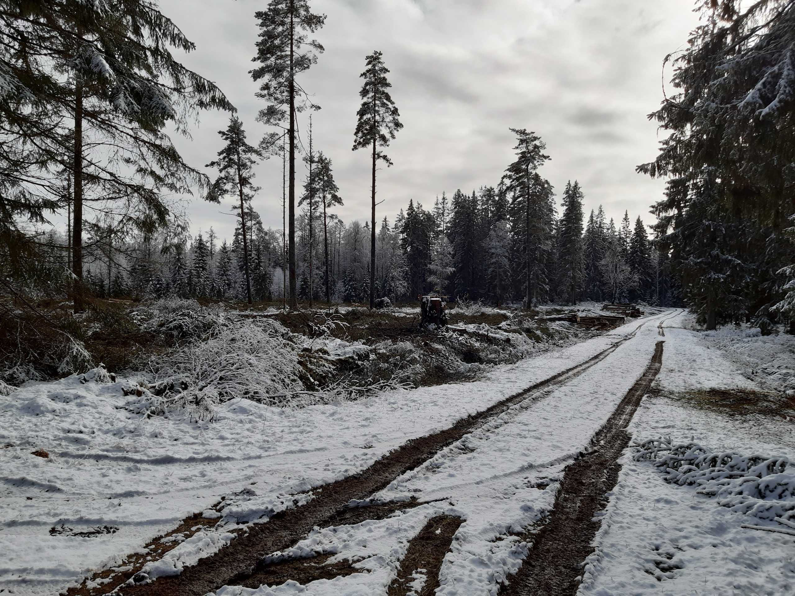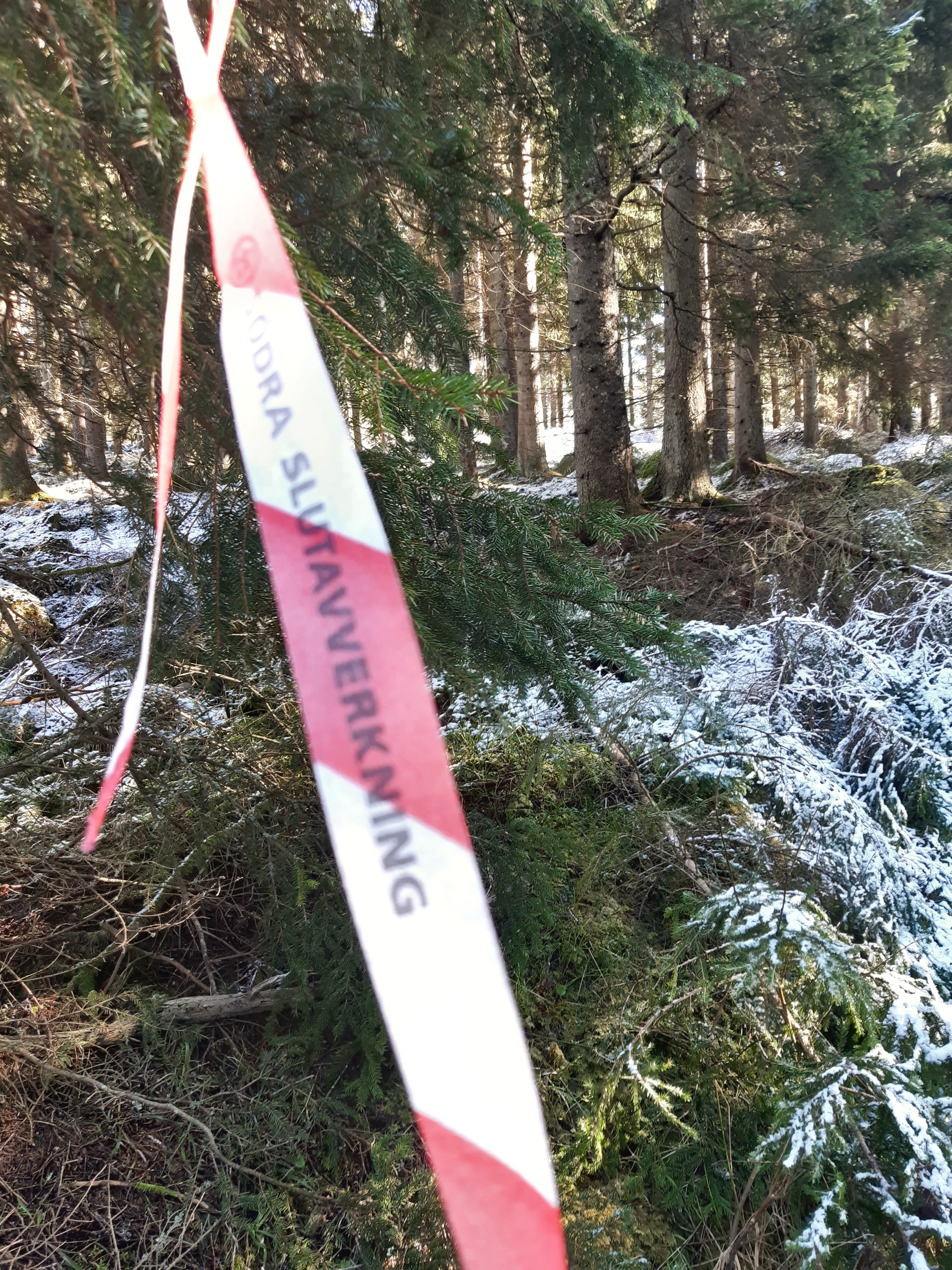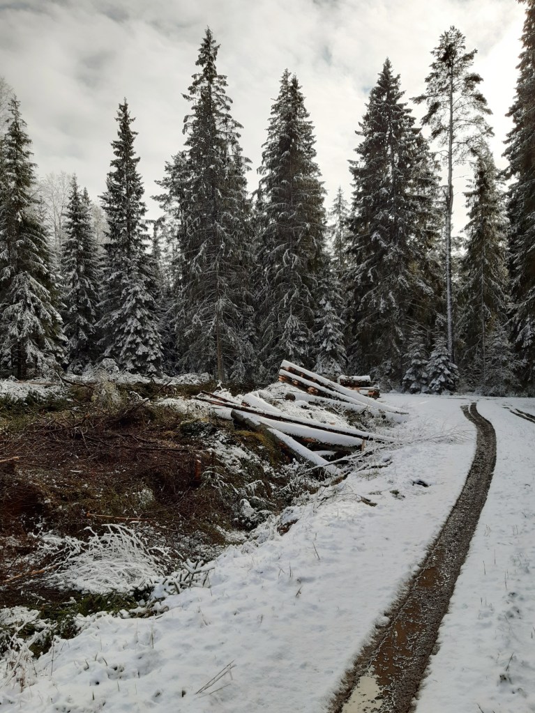 Det var med lite blandade känslor jag började gå. Just här kommer inte träden att finnas mer än ett par dagar till. Sedan blir det bara trasig mark, grenar huller om buller och ingen mer vind mellan barr och vajande granar.