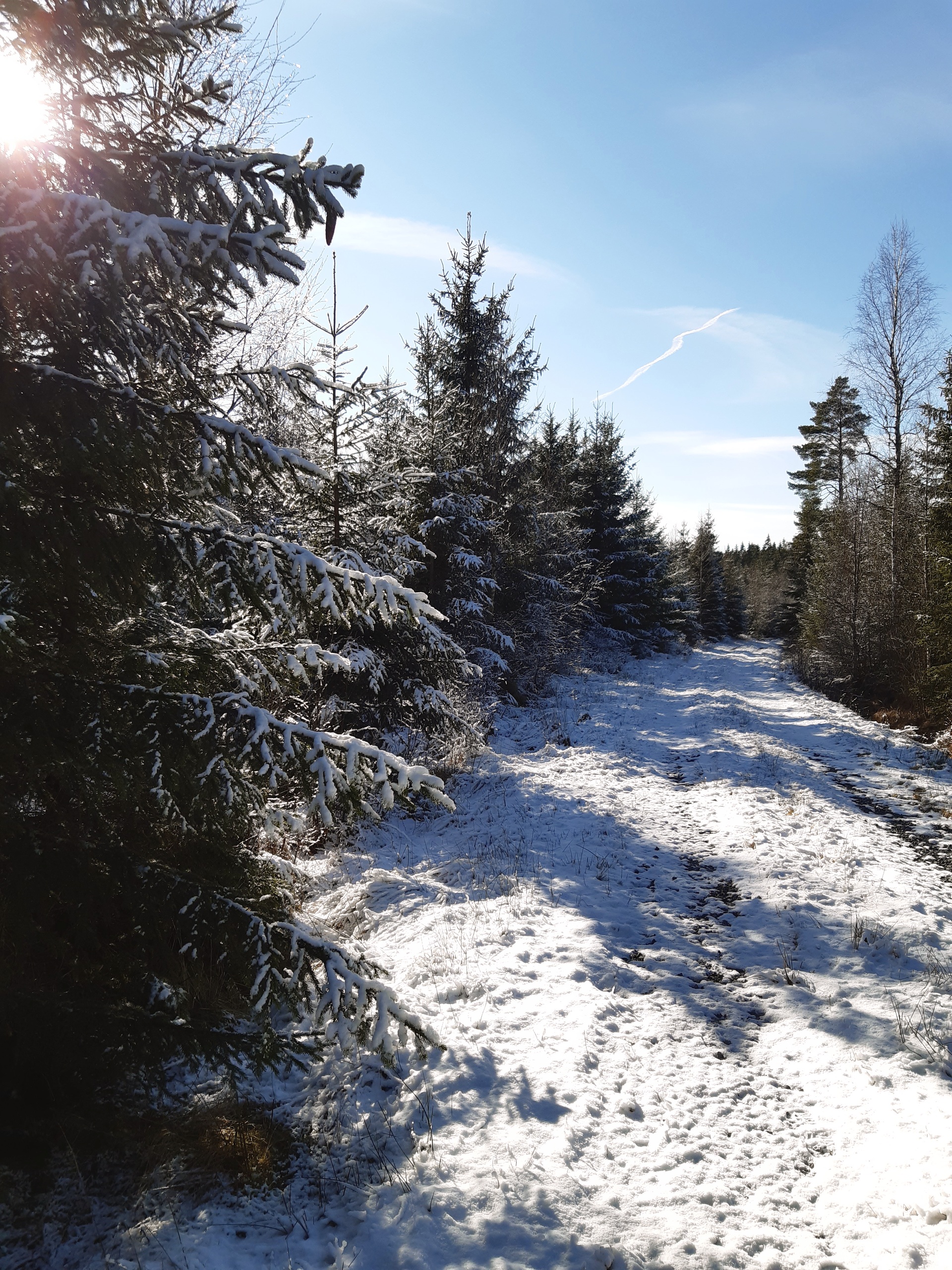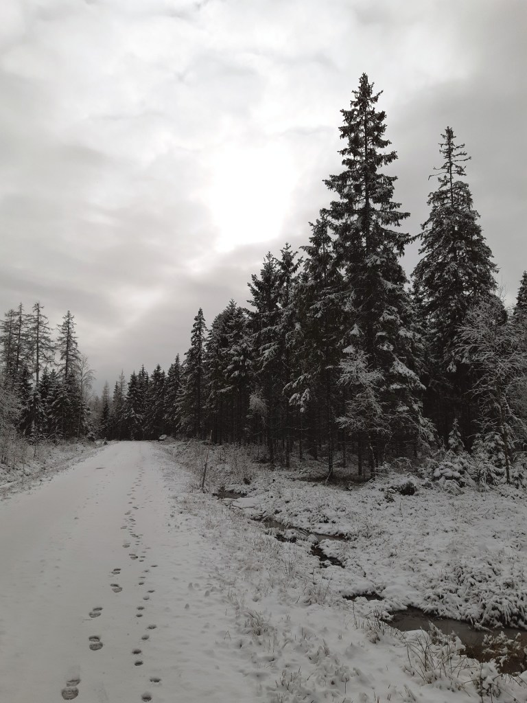 Jag traskade på, började njuta av ljuset igen och lämnade kilometer efter kilometer med spår efter mig. Fotspår och tasspår lite om vartannat. Ibland korsas våra spår av skogens djur, sådana som vi står länge och tittar på innan de upptäcker oss och ibland flyger fåglar nyfiket fram och tittar från en gren på betryggande höjd över oss.