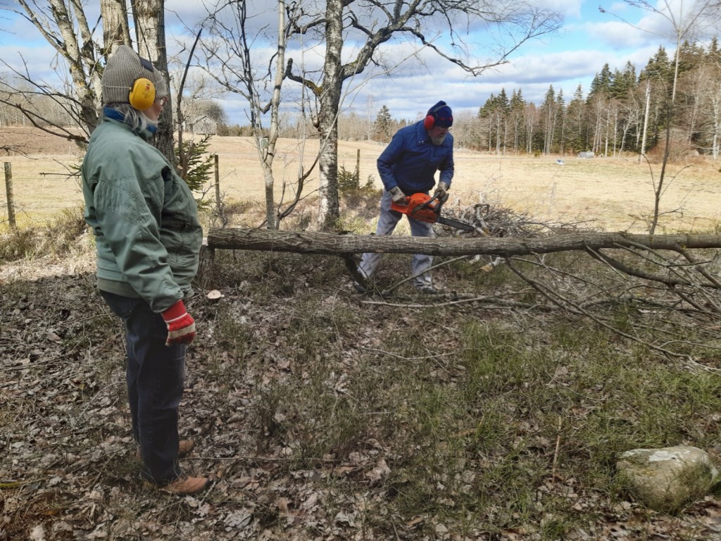 Jag är inte så strukturerad och ordningsam som jag skulle önska att jag var när jag tar mig för saker, inte så som jag skulle vilja vara, men jag har tur att det finns folk som vill hjälpa mig med sådant som jag absolut inte reder ut själv. Som att fälla träd, till exempel. Den här trädgården gjorde att allting liknade ett ödehus när jag flyttade in. På baksidan fanns så mycket sly att det var besvärligt att ta sig fram. En del av slyet hade fått växa upp till träd som stod oroväckande nära huset och det andra var hårt betat av älgar. När jag och mamma började röja bland det minsta slyet insåg jag att skadorna som älgarna orsakat gjorde att de flesta stammarna var drabbade av röta. Därför kändes det som att det var dags att ta ner det andra också. Det är inte roligt att få ett träd över huset.