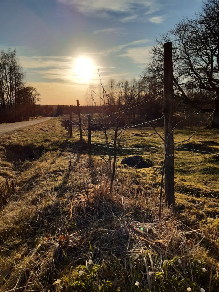 Förra helgen snöade och haglade det, men igår gick jag i shorts och förvånades över hur ”vintergrå” är en alldeles egen nyans av min hud när den för första gången inte täcks av ett tjockt lager kläder. Värmen lockade mig till en sen joggingtur, dock med långa byxor för att inte skrämma ihjäl eventuella mötande. Det hade jag inte behövt oroa mig över för på min 5.6 km runda mötte jag bara ett par glada cykelturister.