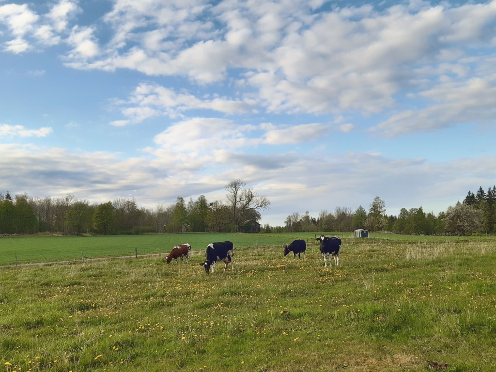 Kossorna kom till hagen utanför mitt hus i förrgår och jag bara satt och satt på en sten och tittade på dem med ett fånigt leende på läpparna.  Det är sommar när kossorna kommer ut på bete. Sommar på riktigt. De tog god tid på sig att hoppa runt, stånga varandra och springa fram och tillbaka innan de började äta av gräset. Det fanns tid att komma fram till mig med och titta nyfiket på vem jag kunde tänkas vara, men bäst var nog ändå gräset.