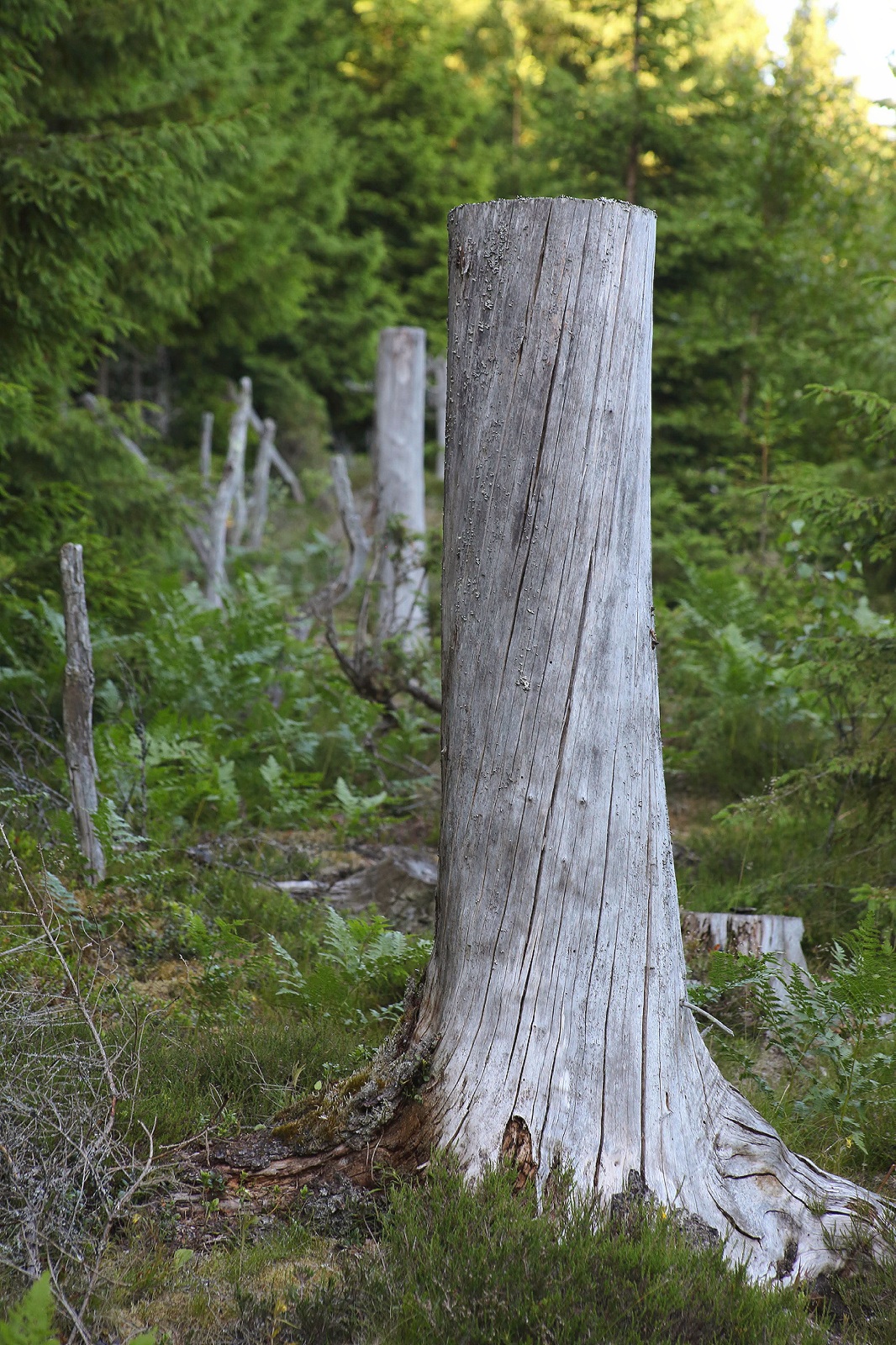 Det här stället tycker jag är lite kusligt att passera och idag var första gången som jag följde linjen av döda träd och stolpar. Det är förmodligen en gammal hage med tanke på stolparnas regelbundna placering, men träden? Jag har aldrig sett något liknande någon annanstans och jag tycker att det mer ser ut som skrovet av ett jättelikt fartyg eller benen av ett gigantiskt djur som inte helt har sjunkit ner i mossan och riset.