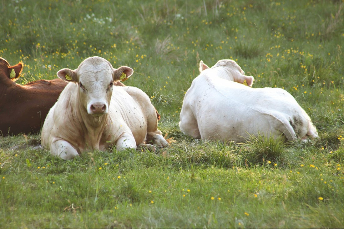 Fler som tycker att det är härligt i gräset är de här unga tjurarna. Fast de ligger kvar numera när vi går förbi. Vi har blivit ett inslag i deras vardag, något man inte behöver sluta idissla för. Så skönt, då slipper jag få hjärtat i halsgropen…