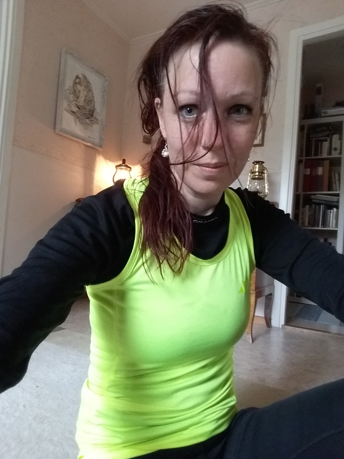 Genomblöt, men nöjd, fick jag lov att göra stretchning, armhävningar och situps inomhus idag. Vidar har börjat vänja sig bättre vid selen nu och drar jämnare och mer än tidigare. Det känns plötsligt som att det kommer att bli riktigt bra till slut!