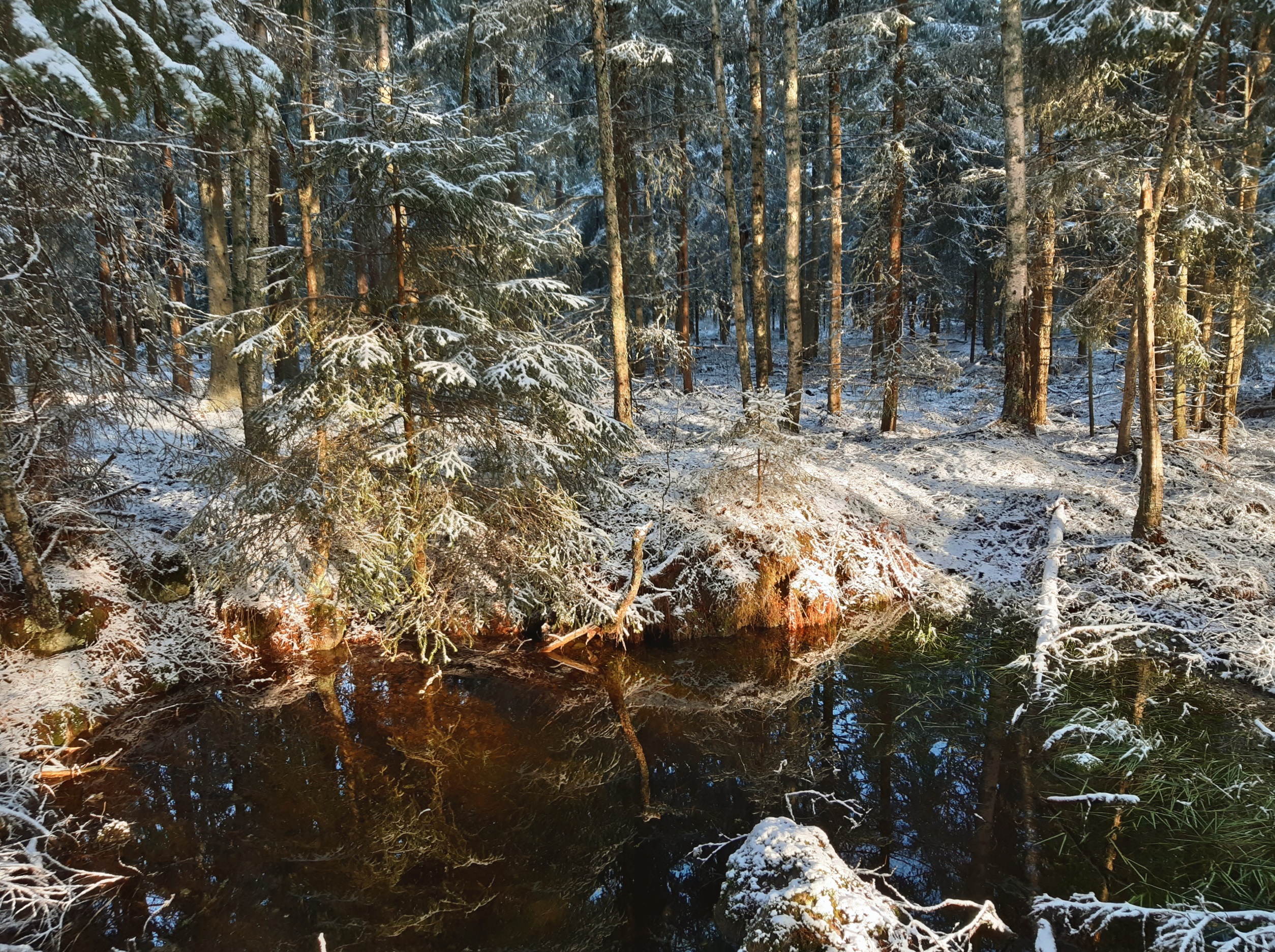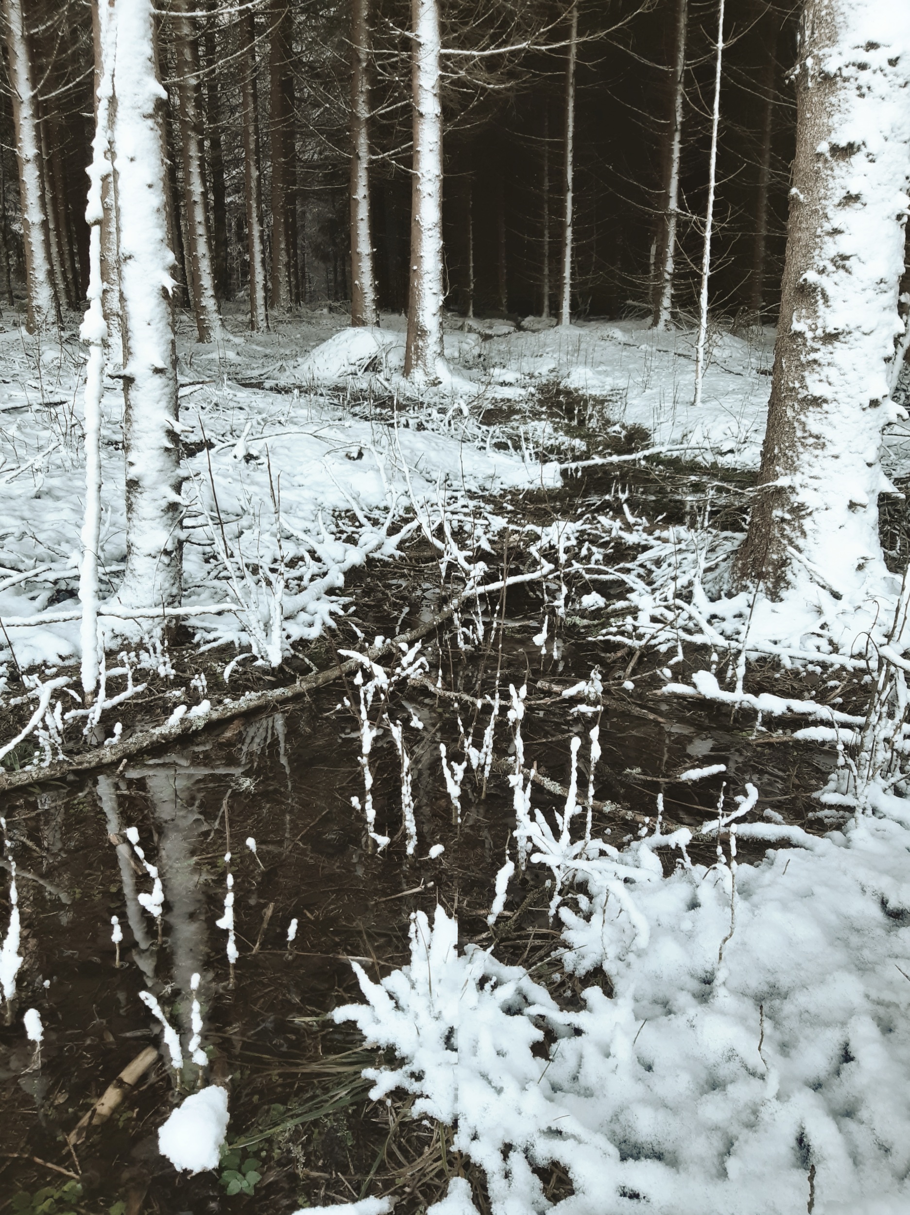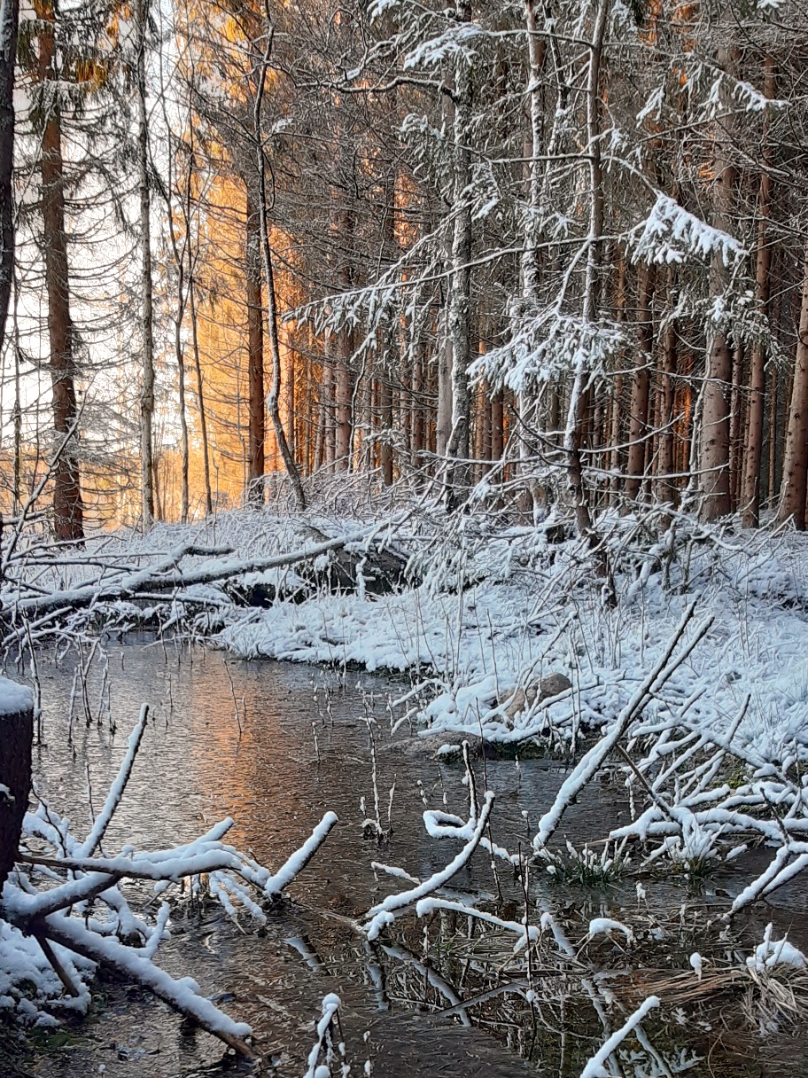 Ett tag nu i mörkaste och blötaste vintern började jag i mitt missmod tänka att jag nog aldrig skulle kunna tycka om att gå i skogarna häromkring. Jag tänkte inte ens på att den största delen av tiden var jag tvungen att ha pannlampa på mig och ändå snavade oräkneligt antal gånger för att jag knappt ens såg handen framför mig. Eller så stormade det så mycket att jag bara vågade gå ut på tomten eller där det inte finns träd.