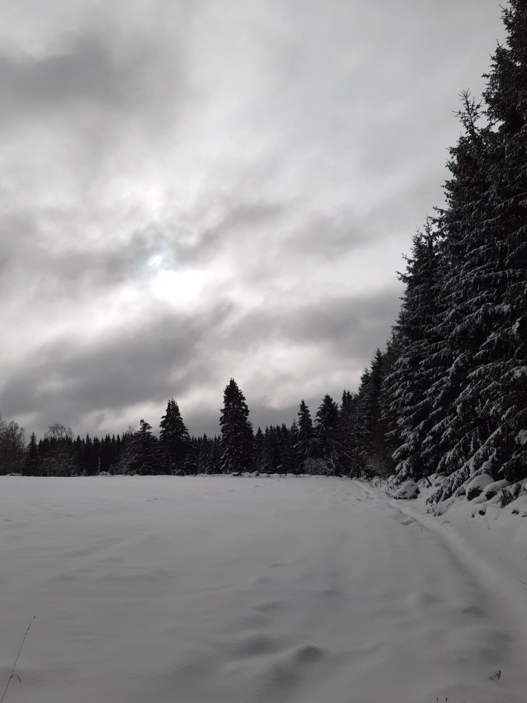 I går glömde jag att ta med mig kameran ut. Jag glömde till och med att ta med mig mobilen. Men jag är glad för det. Istället njöt jag av att pulsa i snön, höra mina andetag och skogens absoluta tystnad. Det brusade i mina öron. Inte bara drevskallen har tystnat, när vinden mojnar och snön dämpar alla andra ljud kan man bara höra trädens knäppande, iskristallers krispiga klingande när de rasar av grenar och enstaka svirranden av vingar. Jag kan lyssna i en evighet.